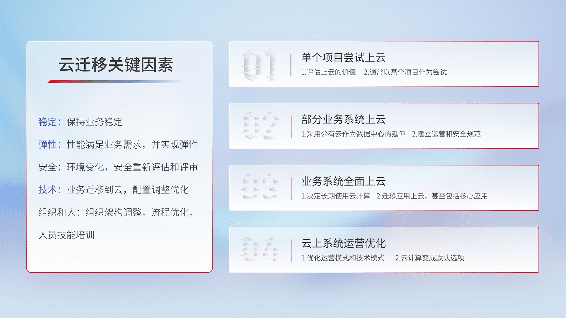结合实际业务,,,,从规划设计、、、云平台选型、、、云原生改造、、、、数据迁移、、、集成交付,,迁移全过程为客户识别最佳上云路径,,,做好风险识别管理,,设计网络架构、、、身份权限、、安全审计合规、、、、操作审计、、日志审计、、、监控告警策略、、、、多站点容灾设计等,,对云上基础设施进行整体规划,,提升IT治理水平,,,以满足弹性、、高可用、、高性能的需求。。